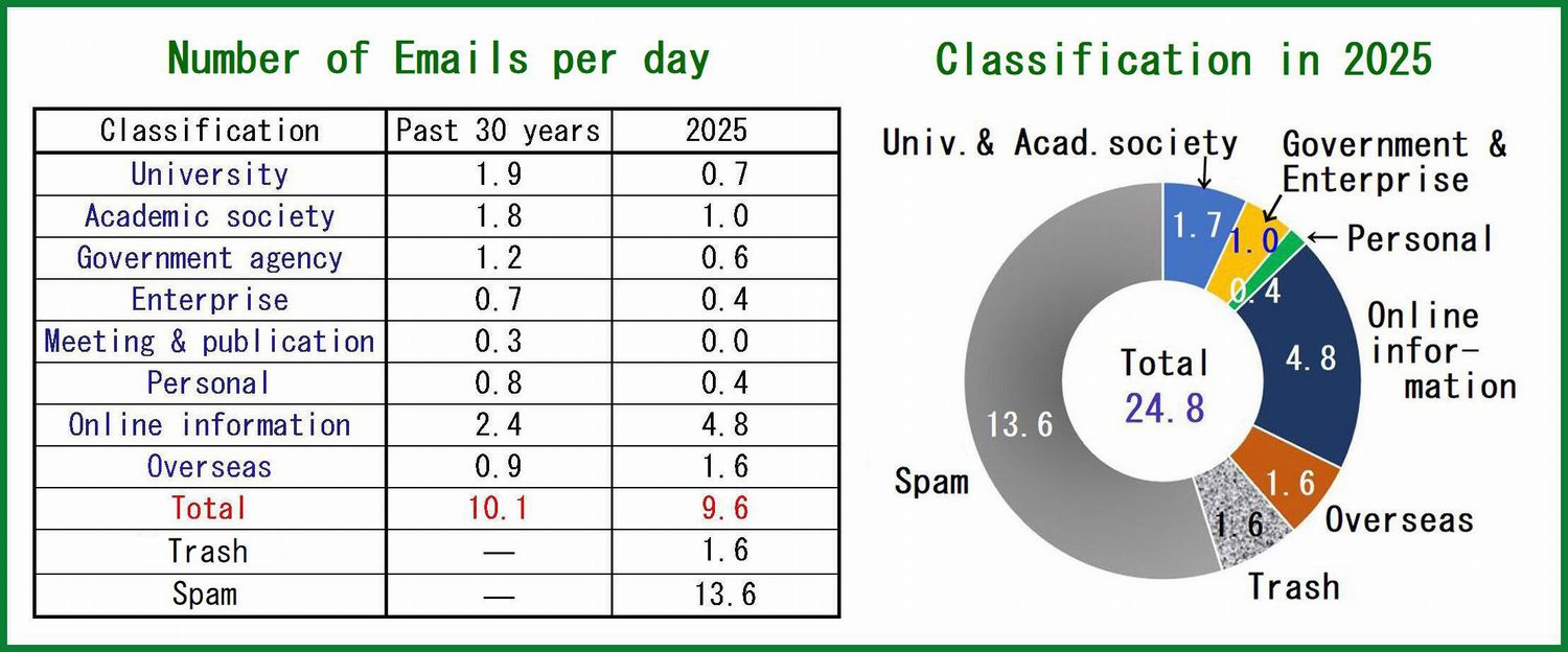 4. The halving of emails for personal correspondence was surprising. This is a result of the shift of interpersonal communication to social networking services (SNS) such as LINE, Instagram, and Facebook.