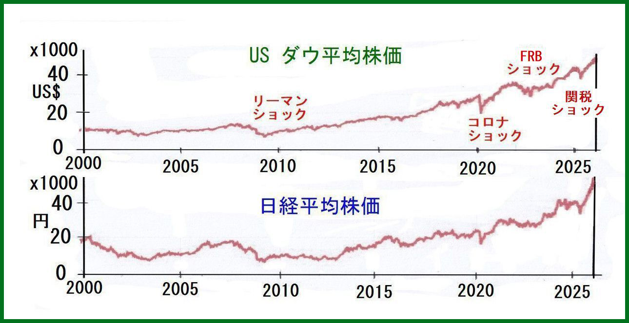 上図に、今世紀に入ってからの日経平均株価とアメリカのダウ平均株価の推移を示している。一見すると驚くほど似ている。2008年に起こったリーマンショックの大暴落を乗り越えて以来、株価には総じて上昇の機運が続いている。直近の8年間はとくに好調で、日米共に平均株価は2.5倍に上昇した。株式への投資者は、大きなリターンを享受したことだろう。私のバランス型ファンドでは、株式の割合が約半分になっている。それでも総額は初期投資の1.7倍に増える恩恵を受けた。年利に換算すると7.0%になり、銀行預金の金利とは比較にならない高さである。なお、同じ8年間で、日本の消費者物価指数は1.13倍の高騰を示した。