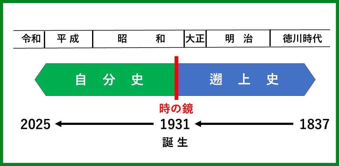 私という一人の人間は、誕生以来94年の自分史を辿ってきた。しかし、上図のように誕生の年に時の鏡を置き、時を経るに従って、鏡の中の自分は時を遡って過去に向かうと考えよう。すると私の自分史は、鏡の中では1837