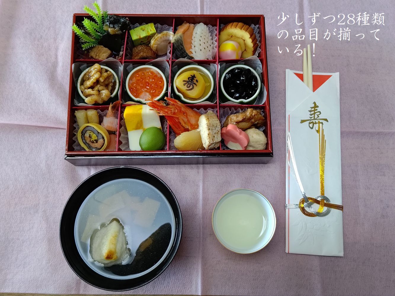 昨夜は長男一家の家で過ごし、賑やかに年越し蕎麦を食べ、除夜の鐘を聞いて帰宅した。朝は一人静かに膳に向かう。屠蘇、雑煮、用意したお節の数々、無いのはお煮しめだけで、形はほぼ整っている。暮れに頂いた21年熟成の大吟醸を屠蘇替わりに杯を挙げる。世界平和と家族の健康を願いながら。儀式は終わった。仕事始めは、賀状の返事書きだ。善はは急げと、終日誰と話すこともなく、100通ほど書き上げて寝に就く。初夢は何だろう?